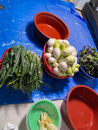 다음날 김장에 쓸 무와 대파, 쪽파, 갓을 미리 씻어 놓습니다. 무를 씻을 때 수세미로 문질러서 흙을 모두 제거합니다. 갓도 여러번 씻어서 흙을 모두 없애야 합니다. 갓을 구매하실 때 흙이 너무 많이 묻어 있으면 씻을 때 힘드므로 잘 확인하시고 구매하셔야 합니다.