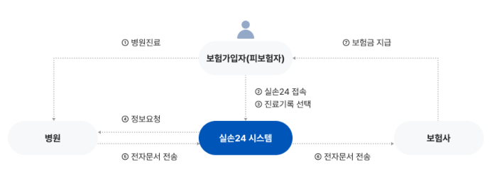 ✅ 청구절차 : (가입자)병원진료 > (가입자)실손24 접속 > (가입자)진료기록 선택 > (실손24)병원으로 정보요청 > (병원)실손24로 전자문서 전송 > (실손24)보험사로 전자문서 전송 > (보험사)보험금지급