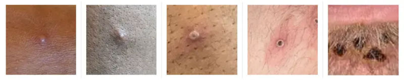 수두, 대상포진, 단순포진과 달리 엠폭스의 발진 특징은 머리부터 시작해서 전신 팔다리 쪽으로 진행하며 경계가 명확하고 중앙이 파인 수포성 발진 형태를 보입니다
