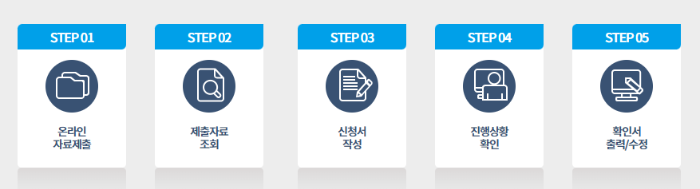 ✅ 온라인자료제출 > 제출자료조회 > 신청서작성 > 진행상황 확인 > 확인서출력